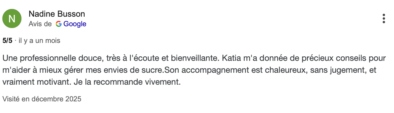 Vous accompagner jusqu'à la réussite : retrouvez votre poids de forme sans sacrifier votre santé ni votre gourmandise. Tout est pris en compte, votre rythme, comportement alimentaire, blocages, hygiène de vie, spécificités médicales, charge mentale, environnement.. rien n'est laissé au hasard et c'est pour ça que marche aussi bien.